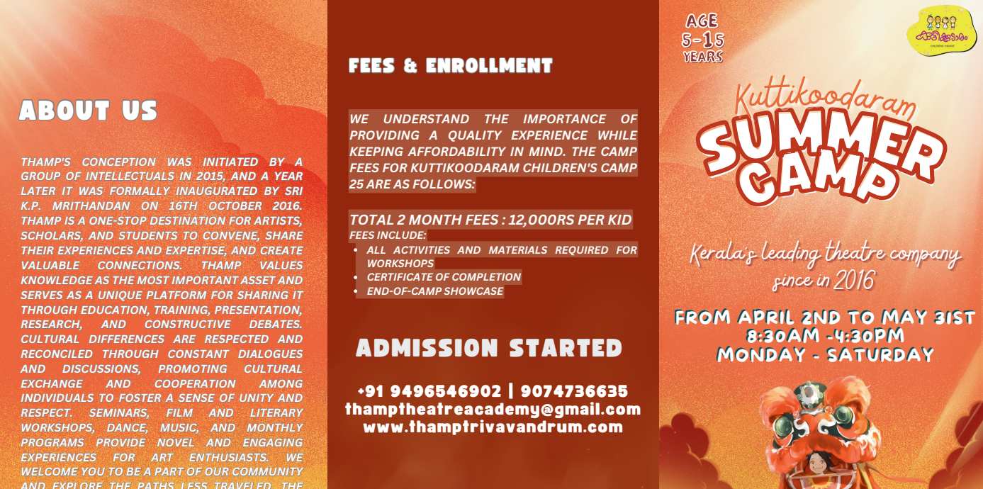 With specialized trainers in each field, your child will have the opportunity to explore diverse activities, develop new skills, and create lasting memories. The KUTTIKOODARAM Summer Camp is the perfect place for children to experience a summer full of fun, creativity, and learning.